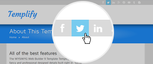 The WYSIWYG Web Builder 9 Template Templify has many fancy and professional designed details built right in. Social media icons, custom Google Web Fonts, and expert use of te master frame / master objects are just a few examples.
